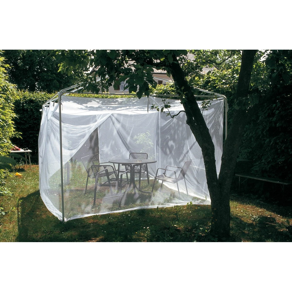 Merkmale: nicht imprägniert; Das Netz hat eine Eingangsöffnung und viele Befestigungsbänder; keine Aufstellstangen oder Gerüste im Lieferumfang; passt perfekt an die sogenannten Partyzelt-Gerüste mit 3 m Seitenlänge