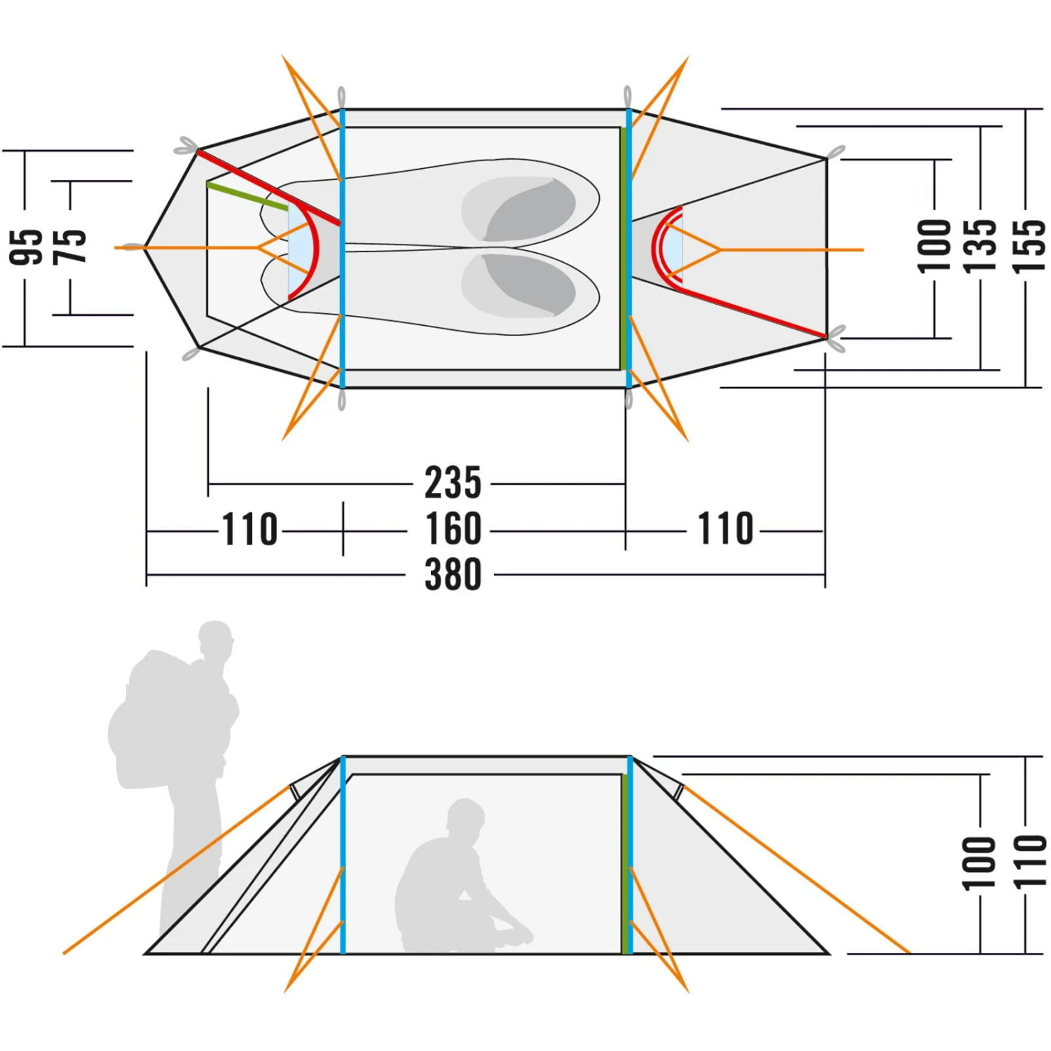 Merkmale: Tunnelzelt mit zwei Gestängebögen; Apside mit Fronteingang; Zwei Eingänge in das Außenzelt; Zwei Lüfter im Außenzelt; Wasserdicht versiegelte Nähte; Wasserdichte Verarbeitung der Abdeckungen, Lüfter und Ansatzpunkte; Reflektierende Zeltleinen; Praktische Packhilfe für Zeltleinen; Verstärkte Eckpunkte mit Gurtbandschlaufen; Extra langes Innenzelt (235 cm) für mehr Liegekomfort; Zwei Eingänge in das Innenzelt, einer davon mit separat verschließbarem Moskitofenster; Zwei Einstecktaschen im Innenzelt neben dem Eingang; Bequeme Einstecktasche in Greifhöhe am Fußende; Wäscheleine im Innenzelt; Eloxiertes Aluminium-Zeltgestänge; Inklusive Packsäcke für Zelt und Gestänge